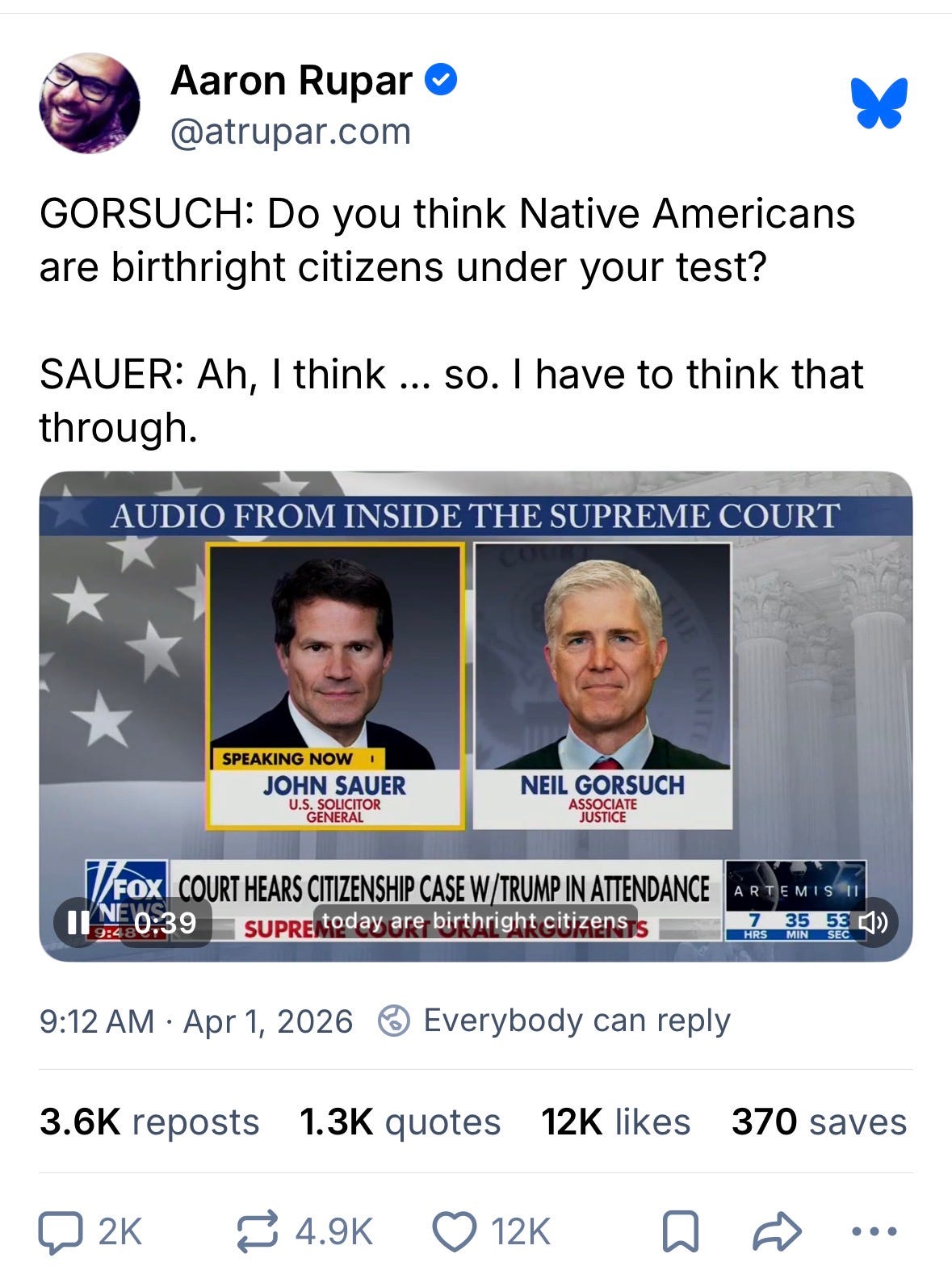 [Solicitor General] John Sauer not being ready to explain to Neil Freaking Gorsuch what happens to Native Americans is…insane.